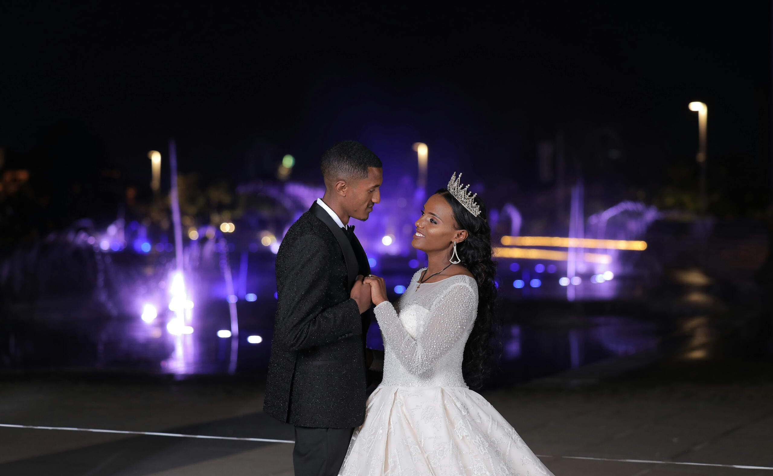 The photographer’s goal was to deliver high-quality, cinematic-style images that emphasized the romantic atmosphere of the wedding.The photos had to maintain a clean, polished look with an elegant balance between natural elements (water fountain lights) and the couple's regal attire. Specific requirements included: