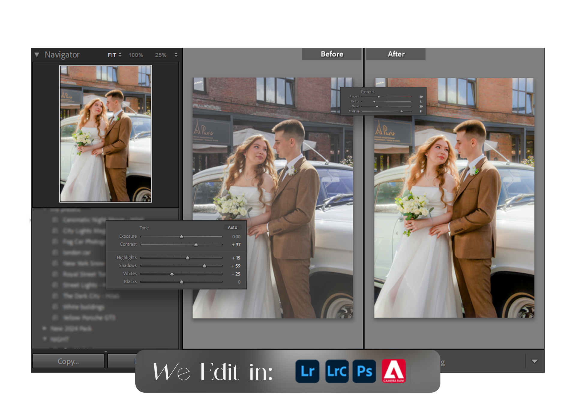 The photographer provided raw wedding images and requested a professional editing touch.The objective was to achieve a soft, romantic, and elegant look while refining colors, exposure, and overall image composition.