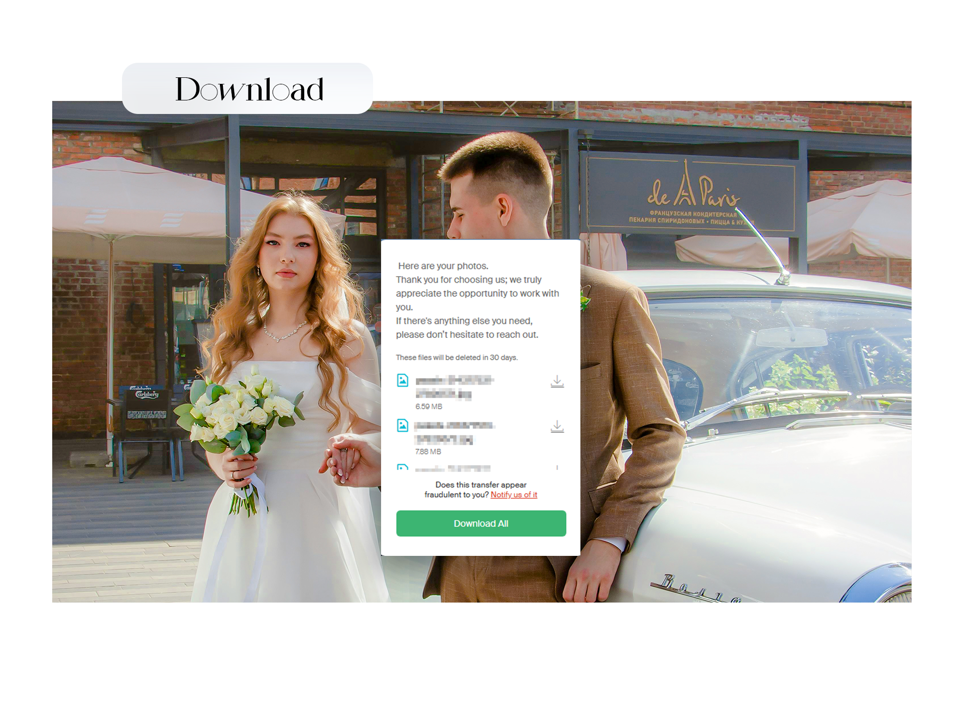 We create a beautiful online gallery via Pixieset.com so your clients can easily view, share, and download their photos.